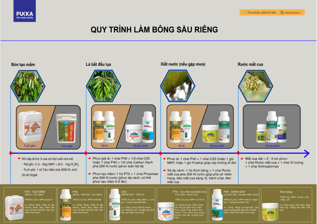 Làm bông sầu riêng là một giai đoạn quan trọng quyết định năng suất và chất lượng trái sầu riêng, ảnh hưởng trực tiếp đến kinh tế của nông dân. Tuy nhiên, không ít nhà vườn gặp khó khăn trong việc này. Trong bài viết này, Pucka xin chia sẻ một số kỹ thuật về làm bông sầu riêng.