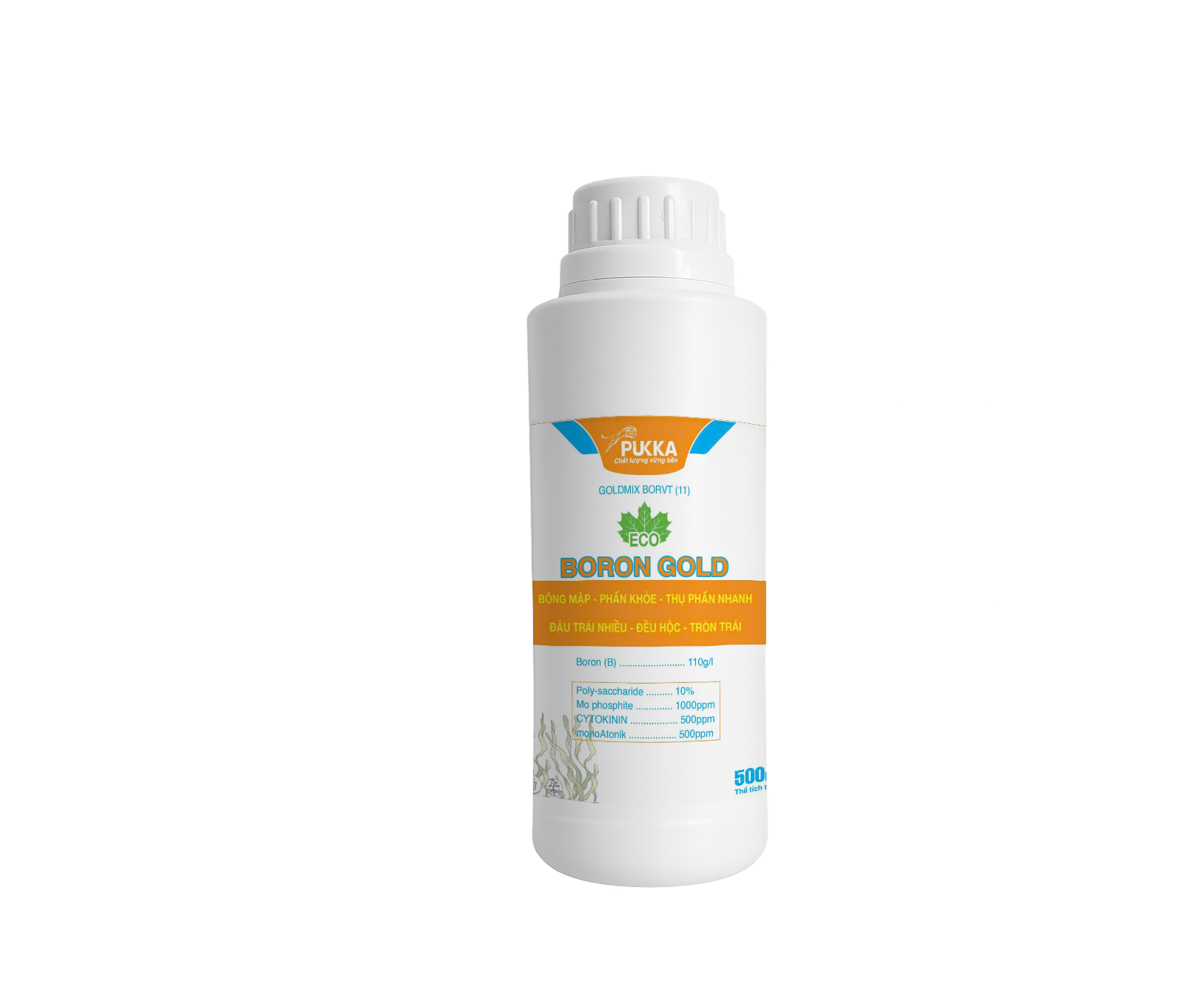 - (%m/v): Boron (B) 110 g/l và các phụ gia Polysaccharide 10%, Cytokinin 10%, Mo – phosphite 500 ppm và MonoAtonik 500 ppm